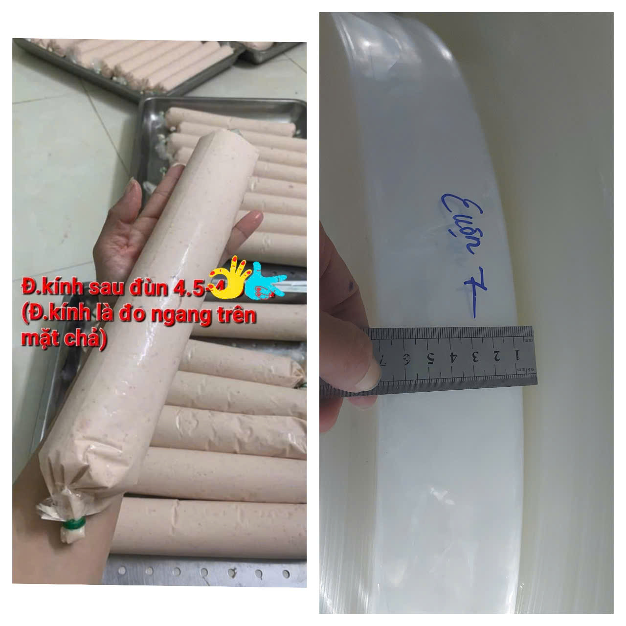 - Túi chiều ngang 1 bên 12cm => đường kính tròn sau đùn ~ 7,6cm (thường chả nửa kg sẽ dùng kích thước này)